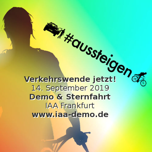 Am Samstag, 14. September findet in Frankfurt anlässlich der Internationalen Automobilausstellung eine große Fahrrad-Sternfahrt und Demonstration unter dem Motto "Aussteiegen - Verkehrswende jetzt!" statt.